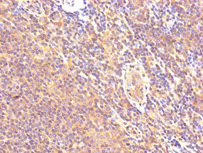 IHC image of CSB-PA004561YA01HU diluted at 1:500 and staining in paraffin-embedded human lymph node tissue performed on a Leica BondTM system. After dewaxing and hydration, antigen retrieval was mediated by high pressure in a citrate buffer (pH 6.0). Section was blocked with 10% normal goat serum 30min at RT. Then primary antibody (1% BSA) was incubated at 4°C overnight. The primary is detected by a biotinylated secondary antibody and visualized using an HRP conjugated SP system.