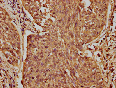 IHC image of CSB-PA773036LA01HU diluted at 1:100 and staining in paraffin-embedded human cervical cancer performed on a Leica BondTM system. After dewaxing and hydration, antigen retrieval was mediated by high pressure in a citrate buffer (pH 6.0). Section was blocked with 10% normal goat serum 30min at RT. Then primary antibody (1% BSA) was incubated at 4°C overnight. The primary is detected by a biotinylated secondary antibody and visualized using an HRP conjugated SP system.