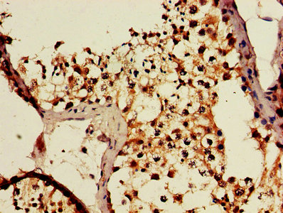 IHC image of CSB-PA004578LA01HU diluted at 1:600 and staining in paraffin-embedded human testis tissue performed on a Leica BondTM system. After dewaxing and hydration, antigen retrieval was mediated by high pressure in a citrate buffer (pH 6.0). Section was blocked with 10% normal goat serum 30min at RT. Then primary antibody (1% BSA) was incubated at 4°C overnight. The primary is detected by a biotinylated secondary antibody and visualized using an HRP conjugated SP system.
