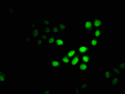 Immunofluorescence staining of Hela cells with CSB-PA004600EA01HU at 1:100, counter-stained with DAPI. The cells were fixed in 4% formaldehyde, permeabilized using 0.2% Triton X-100 and blocked in 10% normal Goat Serum. The cells were then incubated with the antibody overnight at 4°C. The secondary antibody was Alexa Fluor 488-congugated AffiniPure Goat Anti-Rabbit IgG(H+L).