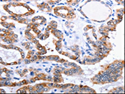 The image on the left is immunohistochemistry of paraffin-embedded Human thyroid cancer tissue using CSB-PA843257(CCND1 Antibody) at dilution 1/25, on the right is treated with synthetic peptide. (Original magnification: ×200)