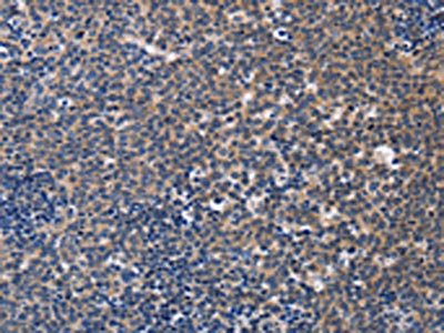 The image on the left is immunohistochemistry of paraffin-embedded Human Lymphoma tissue using CSB-PA244343(CCR6 Antibody) at dilution 1/50, on the right is treated with synthetic peptide. (Original magnification: ×200)