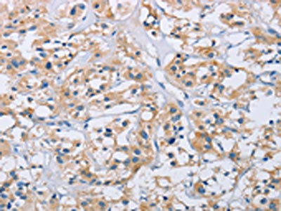 The image on the left is immunohistochemistry of paraffin-embedded Human thyroid cancer tissue using CSB-PA035070(CCR9 Antibody) at dilution 1/60, on the right is treated with fusion protein. (Original magnification: ×200)