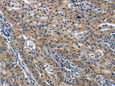 The image on the left is immunohistochemistry of paraffin-embedded Human gastric cancer tissue using CSB-PA787597(CD160 Antibody) at dilution 1/30, on the right is treated with fusion protein. (Original magnification: ×200)