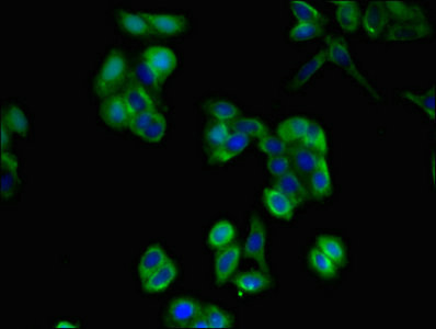 Immunofluorescent analysis of HepG2 cells using CSB-PA09479A0Rb at dilution of 1:100 and Alexa Fluor 488-congugated AffiniPure Goat Anti-Rabbit IgG(H+L)