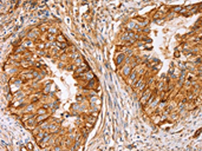 The image on the left is immunohistochemistry of paraffin-embedded Human cervical cancer tissue using CSB-PA778176(CD59 Antibody) at dilution 1/50, on the right is treated with synthetic peptide. (Original magnification: ×200)