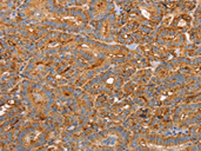The image on the left is immunohistochemistry of paraffin-embedded Human thyroid cancer tissue using CSB-PA778176(CD59 Antibody) at dilution 1/50, on the right is treated with synthetic peptide. (Original magnification: ×200)