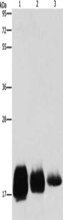Gel: 10%SDS-PAGE, Lysate: 40 μg, Lane 1-3: Huvec cells, hela cells, SKOV3 cells, Primary antibody: CSB-PA778176(CD59 Antibody) at dilution 1/500, Secondary antibody: Goat anti rabbit IgG at 1/8000 dilution, Exposure time: 30 seconds