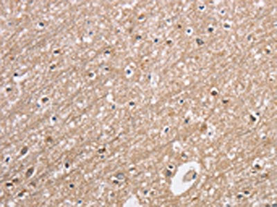 The image on the left is immunohistochemistry of paraffin-embedded Human brain tissue using CSB-PA924477(CDC34 Antibody) at dilution 1/40, on the right is treated with synthetic peptide. (Original magnification: ×200)