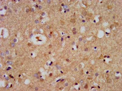 IHC image of CSB-PA22709A0Rb diluted at 1:500 and staining in paraffin-embedded human brain tissue performed on a Leica BondTM system. After dewaxing and hydration, antigen retrieval was mediated by high pressure in a citrate buffer (pH 6.0). Section was blocked with 10% normal goat serum 30min at RT. Then primary antibody (1% BSA) was incubated at 4°C overnight. The primary is detected by a biotinylated secondary antibody and visualized using an HRP conjugated SP system.