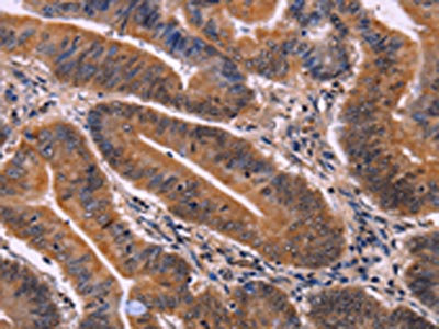 The image on the left is immunohistochemistry of paraffin-embedded Human colon cancer tissue using CSB-PA478063(CDC5L Antibody) at dilution 1/40, on the right is treated with fusion protein. (Original magnification: ×200)