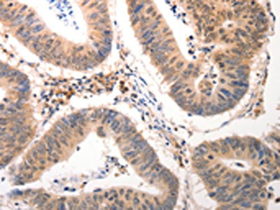 The image on the left is immunohistochemistry of paraffin-embedded Human colon cancer tissue using CSB-PA245457(CDC6 Antibody) at dilution 1/25, on the right is treated with synthetic peptide. (Original magnification: ×200)