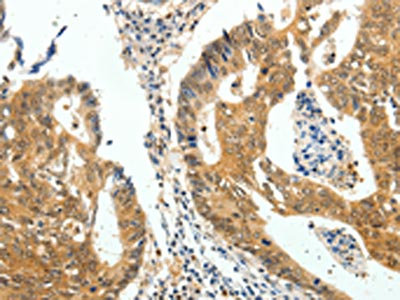 The image on the left is immunohistochemistry of paraffin-embedded Human colon cancer tissue using CSB-PA924854(CDH23 Antibody) at dilution 1/60, on the right is treated with fusion protein. (Original magnification: ×200)