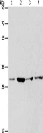 Gel: 8%SDS-PAGE, Lysate: 40 μg, Lane 1-4: A431 cells, 231 cells, hela cells, human fetal liver tissue, Primary antibody: CSB-PA267352(CDK2 Antibody) at dilution 1/250, Secondary antibody: Goat anti rabbit IgG at 1/8000 dilution, Exposure time: 1 minute