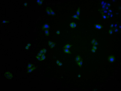 Immunofluorescence staining of Hela cells with CSB-PA005074LA01HU at 1:100, counter-stained with DAPI. The cells were fixed in 4% formaldehyde and blocked in 10% normal Goat Serum. The cells were then incubated with the antibody overnight at 4°C. The secondary antibody was Alexa Fluor 488-congugated AffiniPure Goat Anti-Rabbit IgG(H+L).