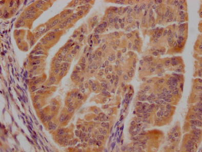 IHC image of CSB-PA005074LA01HU diluted at 1:300 and staining in paraffin-embedded human endometrial cancer performed on a Leica BondTM system. After dewaxing and hydration, antigen retrieval was mediated by high pressure in a citrate buffer (pH 6.0). Section was blocked with 10% normal goat serum 30min at RT. Then primary antibody (1% BSA) was incubated at 4°C overnight. The primary is detected by a Goat anti-rabbit polymer IgG labeled by HRP and visualized using 0.05% DAB.