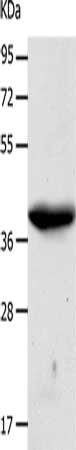 Gel: 10%SDS-PAGE, Lysate: 60 μg, Lane: A549 cells, Primary antibody: CSB-PA440881(CDK7 Antibody) at dilution 1/500, Secondary antibody: Goat anti rabbit IgG at 1/8000 dilution, Exposure time: 2 minutes