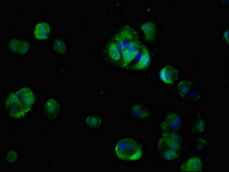 Immunofluorescent analysis of MCF-7 cells using CSB-PA679696LA01HU at dilution of 1:100 and Alexa Fluor 488-congugated AffiniPure Goat Anti-Rabbit IgG(H+L)