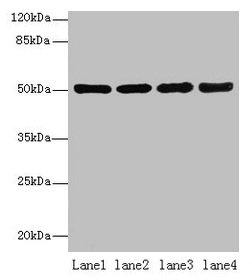 Predicted band size: 58, 46, 36, 39, 51, 47, 28, 44, 52, 40 kDa