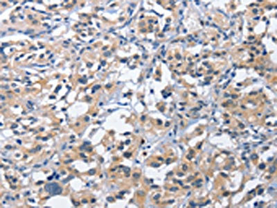 The image on the left is immunohistochemistry of paraffin-embedded Human thyroid cancer tissue using CSB-PA260295(CEACAM3 Antibody) at dilution 1/60, on the right is treated with fusion protein. (Original magnification: ×200)