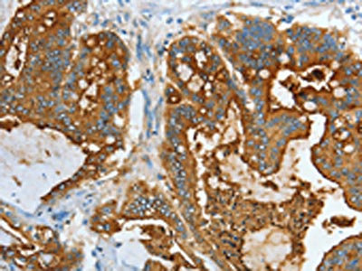 The image on the left is immunohistochemistry of paraffin-embedded Human colon cancer tissue using CSB-PA160116(CEACAM5 Antibody) at dilution 1/20, on the right is treated with fusion protein. (Original magnification: ×200)