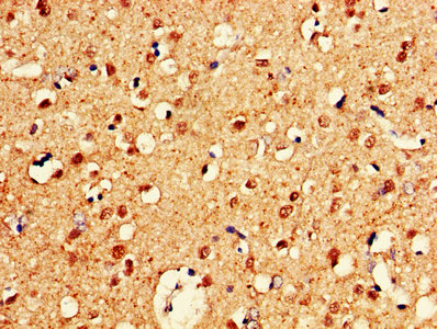 IHC image of CSB-PA006217LA01HU diluted at 1:600 and staining in paraffin-embedded human brain tissue performed on a Leica BondTM system. After dewaxing and hydration, antigen retrieval was mediated by high pressure in a citrate buffer (pH 6.0). Section was blocked with 10% normal goat serum 30min at RT. Then primary antibody (1% BSA) was incubated at 4°C overnight. The primary is detected by a biotinylated secondary antibody and visualized using an HRP conjugated SP system.