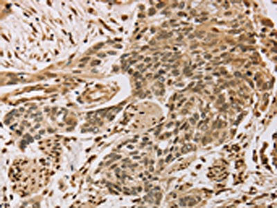The image on the left is immunohistochemistry of paraffin-embedded Human gastic cancer tissue using CSB-PA553324(CENPV Antibody) at dilution 1/30, on the right is treated with synthetic peptide. (Original magnification: ×200)