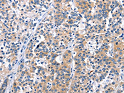 The image on the left is immunohistochemistry of paraffin-embedded Human thyroid cancer tissue using CSB-PA186887(CEP97 Antibody) at dilution 1/25, on the right is treated with fusion protein. (Original magnification: ×200)