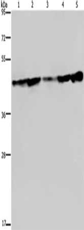 Gel: 8%SDS-PAGE, Lysate: 40 μg, Lane 1-5: Human fetal liver tissue, HT29 cells, HUVEC cells, MCF7 cells, human hepatocellular carcinoma tissue, Primary antibody: CSB-PA957321(CERS4 Antibody) at dilution 1/300, Secondary antibody: Goat anti rabbit IgG at 1/8000 dilution, Exposure time: 10 seconds