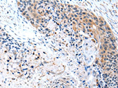 The image on the left is immunohistochemistry of paraffin-embedded Human esophagus cancer tissue using CSB-PA120126(CFC1 Antibody) at dilution 1/20, on the right is treated with synthetic peptide. (Original magnification: ×200)