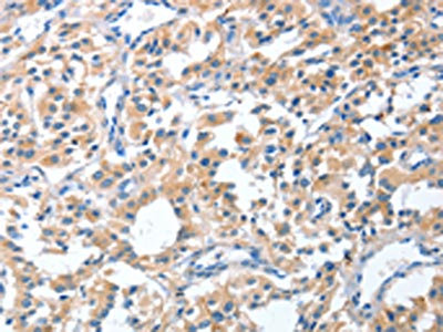 The image on the left is immunohistochemistry of paraffin-embedded Human thyroid cancer tissue using CSB-PA990883(CGB Antibody) at dilution 1/40, on the right is treated with fusion protein. (Original magnification: ×200)