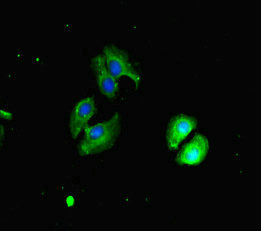 Immunofluorescent analysis of A549 cells using CSB-PA01097A0Rb at dilution of 1:100 and Alexa Fluor 488-congugated AffiniPure Goat Anti-Rabbit IgG(H+L)