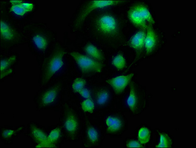 Immunofluorescence staining of U251 cells with CSB-PA005357LA01HU at 1:133, counter-stained with DAPI. The cells were fixed in 4% formaldehyde, permeabilized using 0.2% Triton X-100 and blocked in 10% normal Goat Serum. The cells were then incubated with the antibody overnight at 4°C. The secondary antibody was Alexa Fluor 488-congugated AffiniPure Goat Anti-Rabbit IgG(H+L).