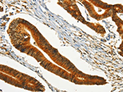The image on the left is immunohistochemistry of paraffin-embedded Human colon cancer tissue using CSB-PA800200(CHRDL2 Antibody) at dilution 1/20, on the right is treated with synthetic peptide. (Original magnification: ×200)