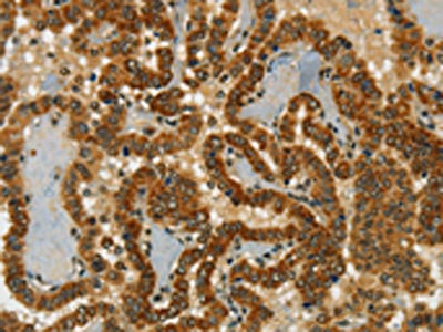 The image on the left is immunohistochemistry of paraffin-embedded Human thyroid cancer tissue using CSB-PA800200(CHRDL2 Antibody) at dilution 1/20, on the right is treated with synthetic peptide. (Original magnification: ×200)