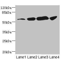 Predicted band size: 57, 56 kDa