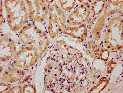 IHC image of CSB-PA005416LA01HU diluted at 1:300 and staining in paraffin-embedded human kidney tissue performed on a Leica BondTM system. After dewaxing and hydration, antigen retrieval was mediated by high pressure in a citrate buffer (pH 6.0). Section was blocked with 10% normal goat serum 30min at RT. Then primary antibody (1% BSA) was incubated at 4°C overnight. The primary is detected by a biotinylated secondary antibody and visualized using an HRP conjugated SP system.