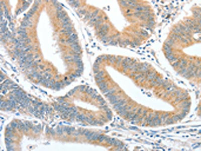 The image on the left is immunohistochemistry of paraffin-embedded Human colon cancer tissue using CSB-PA560972(CKAP2 Antibody) at dilution 1/50, on the right is treated with fusion protein. (Original magnification: ×200)
