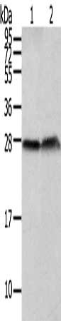 Gel: 12%SDS-PAGE, Lysate: 40 μg, Lane 1-2: Hepg2 and 293T cell, Primary antibody: CSB-PA022208(CLDN19 Antibody) at dilution 1/200 dilution, Secondary antibody: Goat anti rabbit IgG at 1/8000 dilution, Exposure time: 5 seconds