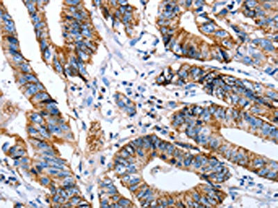 The image on the left is immunohistochemistry of paraffin-embedded Human colon cancer tissue using CSB-PA119092(CLDN7 Antibody) at dilution 1/50, on the right is treated with synthetic peptide. (Original magnification: ×200)