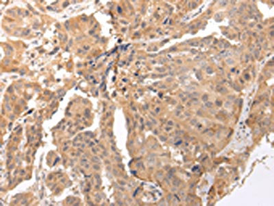 The image on the left is immunohistochemistry of paraffin-embedded Human breast cancer tissue using CSB-PA283108(CLDND2 Antibody) at dilution 1/45, on the right is treated with synthetic peptide. (Original magnification: ×200)