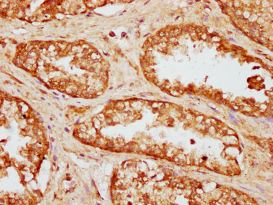 IHC image of CSB-PA866210LA01HU diluted at 1:100 and staining in paraffin-embedded human prostate cancer performed on a Leica BondTM system. After dewaxing and hydration, antigen retrieval was mediated by high pressure in a citrate buffer (pH 6.0). Section was blocked with 10% normal goat serum 30min at RT. Then primary antibody (1% BSA) was incubated at 4°C overnight. The primary is detected by a biotinylated secondary antibody and visualized using an HRP conjugated SP system.