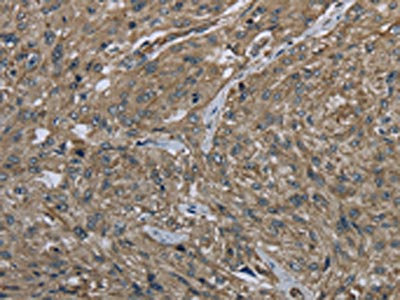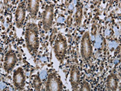 The image on the left is immunohistochemistry of paraffin-embedded Human gastric cancer tissue using CSB-PA591518(CLPS Antibody) at dilution 1/40, on the right is treated with fusion protein. (Original magnification: ×200)