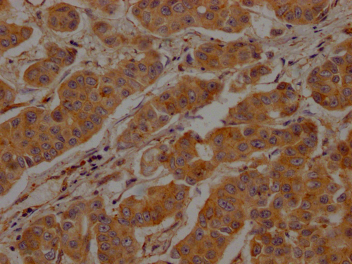 IHC image of CSB-PA005593LA01HU diluted at 1:200 and staining in paraffin-embedded human breast cancer performed on a Leica BondTM system. After dewaxing and hydration, antigen retrieval was mediated by high pressure in a citrate buffer (pH 6.0). Section was blocked with 10% normal goat serum 30min at RT. Then primary antibody (1% BSA) was incubated at 4°C overnight. The primary is detected by a Goat anti-rabbit polymer IgG labeled by HRP and visualized using 0.05% DAB.