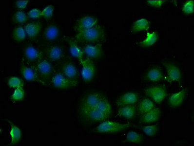 Immunofluorescence staining of A549 cells with CSB-PA005594LA01HU at 1:133, counter-stained with DAPI. The cells were fixed in 4% formaldehyde, permeabilized using 0.2% Triton X-100 and blocked in 10% normal Goat Serum. The cells were then incubated with the antibody overnight at 4°C. The secondary antibody was Alexa Fluor 488-congugated AffiniPure Goat Anti-Rabbit IgG(H+L).