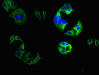 Immunofluorescence staining of HepG2 cells with CSB-PA005642LA01HU at 1:133, counter-stained with DAPI. The cells were fixed in 4% formaldehyde, permeabilized using 0.2% Triton X-100 and blocked in 10% normal Goat Serum. The cells were then incubated with the antibody overnight at 4°C. The secondary antibody was Alexa Fluor 488-congugated AffiniPure Goat Anti-Rabbit IgG(H+L).
