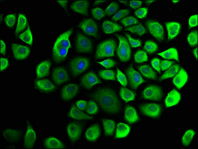 Immunofluorescence staining of Hela cells with CSB-PA005666LA01HU at 1:33, counter-stained with DAPI. The cells were fixed in 4% formaldehyde, permeabilized using 0.2% Triton X-100 and blocked in 10% normal Goat Serum. The cells were then incubated with the antibody overnight at 4°C. The secondary antibody was Alexa Fluor 488-congugated AffiniPure Goat Anti-Rabbit IgG(H+L).