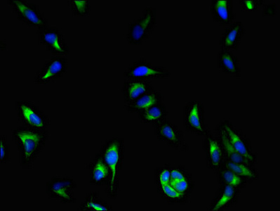 Immunofluorescent analysis of Hela cells using CSB-PA618754LA01HU at dilution of 1:100 and Alexa Fluor 488-congugated AffiniPure Goat Anti-Rabbit IgG(H+L)