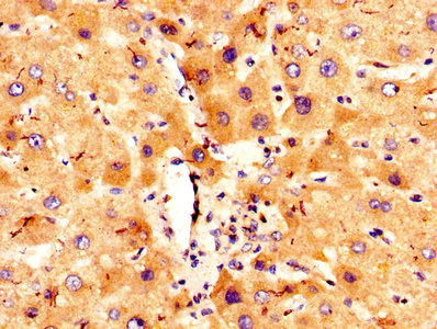 IHC image of CSB-PA896556LA01HU diluted at 1:300 and staining in paraffin-embedded human liver tissue performed on a Leica BondTM system. After dewaxing and hydration, antigen retrieval was mediated by high pressure in a citrate buffer (pH 6.0). Section was blocked with 10% normal goat serum 30min at RT. Then primary antibody (1% BSA) was incubated at 4°C overnight. The primary is detected by a biotinylated secondary antibody and visualized using an HRP conjugated SP system.