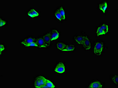 Immunofluorescent analysis of HepG2 cells using CSB-PA005813LA01HU at dilution of 1:100 and Alexa Fluor 488-congugated AffiniPure Goat Anti-Rabbit IgG(H+L)